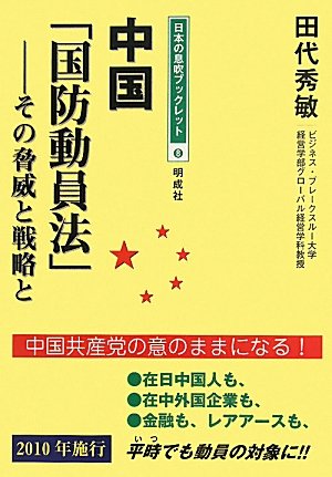 2021-05-28 中国の国防動員法 国際問題 中国には「国防動員法」という法律があり、戦争の際、国民は政府の命令に従わないといけないことになっている。 中国「国防動員法」―その脅威と戦略と (日本の息吹ブックレット) 作者:田代 秀敏 明成社 Amazon 問題なのは、日本にいる、中国人にも適用され、中国政府の指令で日本に対して軍事活動をしないといけない。 つまり、中国から日本にきている中国人って自動的に兵士なのである。 いざ中国と戦争になったら、大変なことになる。
